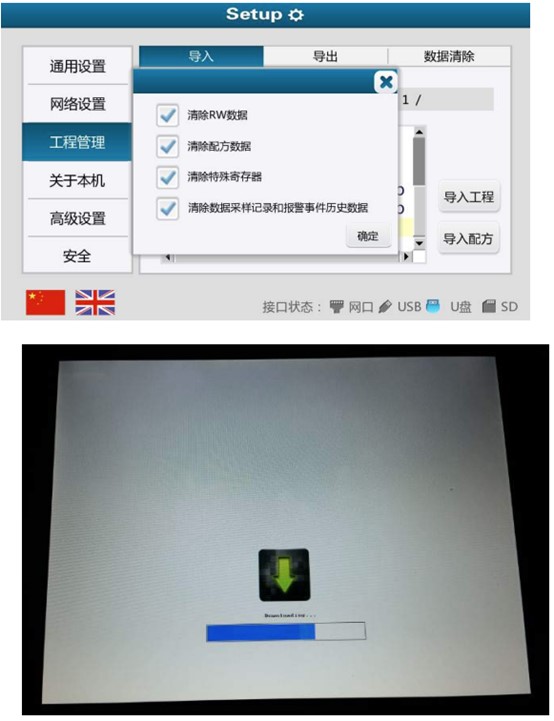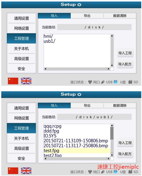 4.選擇 U 盤存放打包文件的路徑,使用“導入工程”選項,等待數(shù)據(jù)傳輸完畢即可,(百度一下速捷工控)