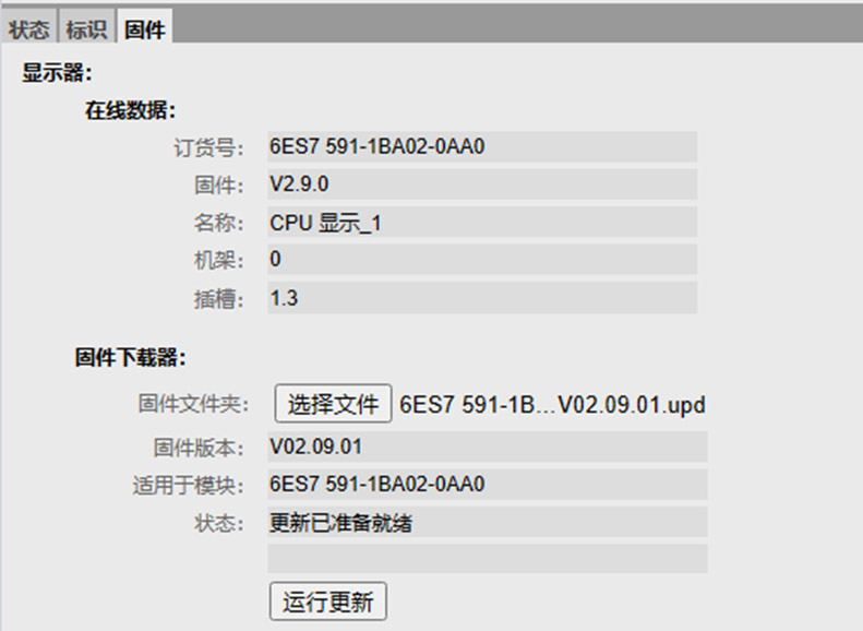 存儲卡的大小要超過固件文件大小,才可使用存儲卡進行固件更新。如:V2.9.2之后,所有S7-1500系列CPU如果通過存儲卡更新,都至少需要256 MB存儲卡;1500顯示屏的固件文件較小,使用至少12 MB的存儲卡即可。